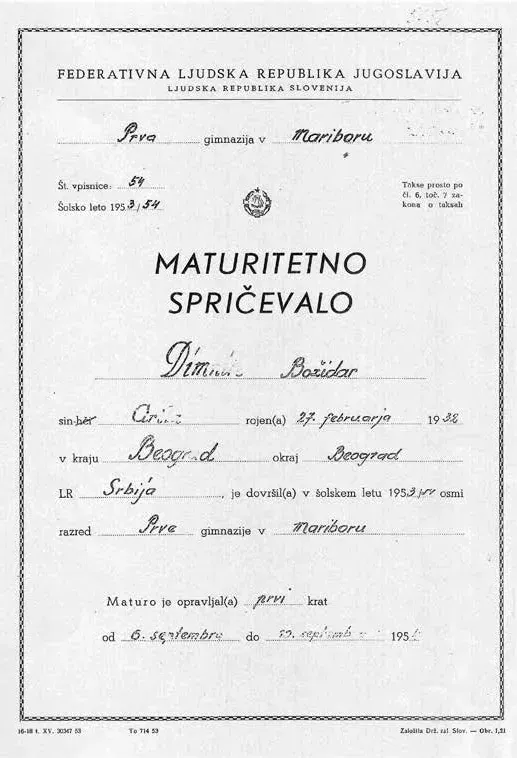 Istočasno sem se učil za izpite. Februarja, tri mesece po izpustitvi, sem napravil izpite za sedmi razred gimnazije v Mariboru, junija leta 1954 pa še za osmi ter z odliko tudi maturo.